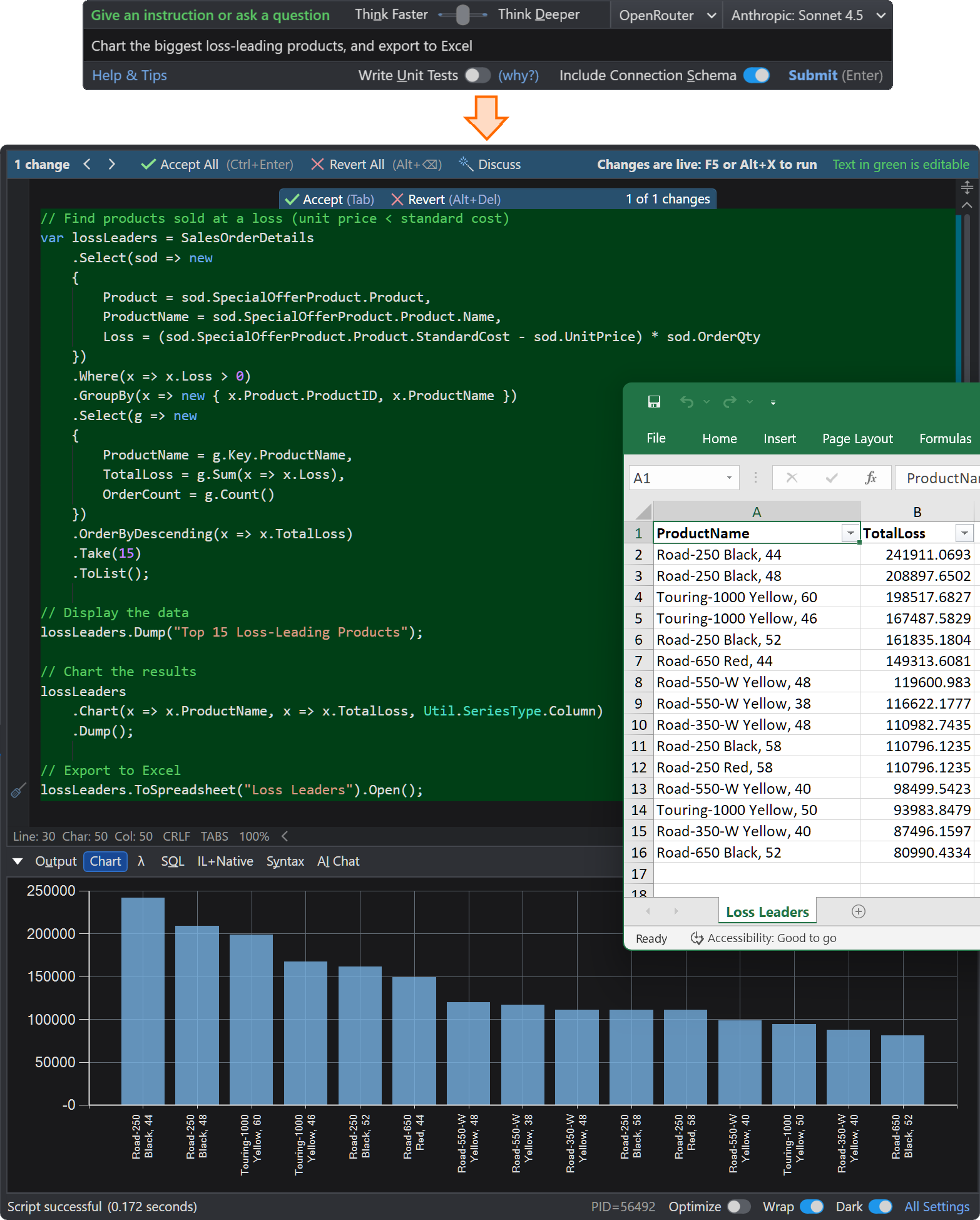 The smart agent can access database schema (with your permission!) and uses LINQPad's compiler to automatically validate its code.