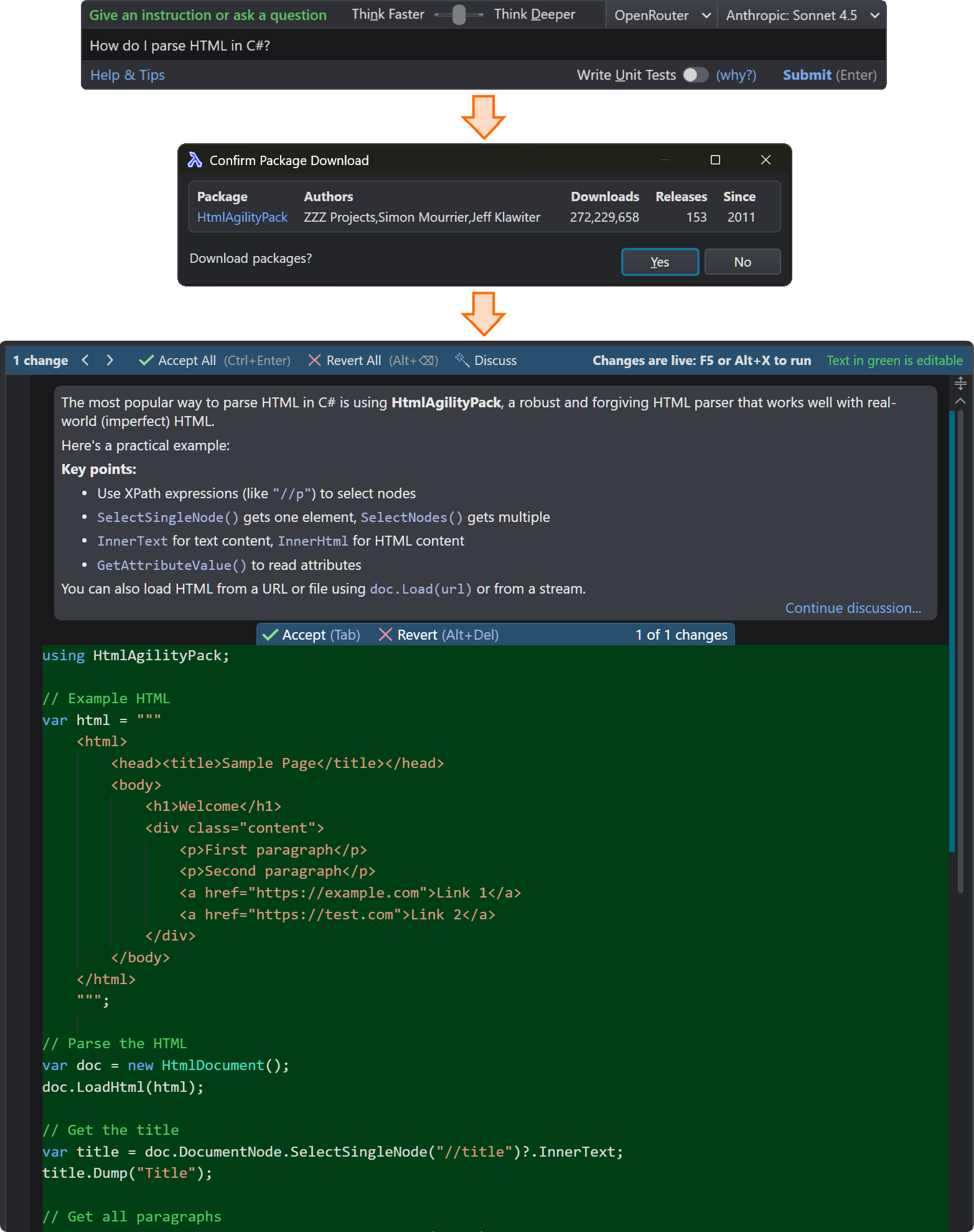 Ask the agent anything about C#, .NET or a NuGet package, and it will give you an answer followed by a working demo!